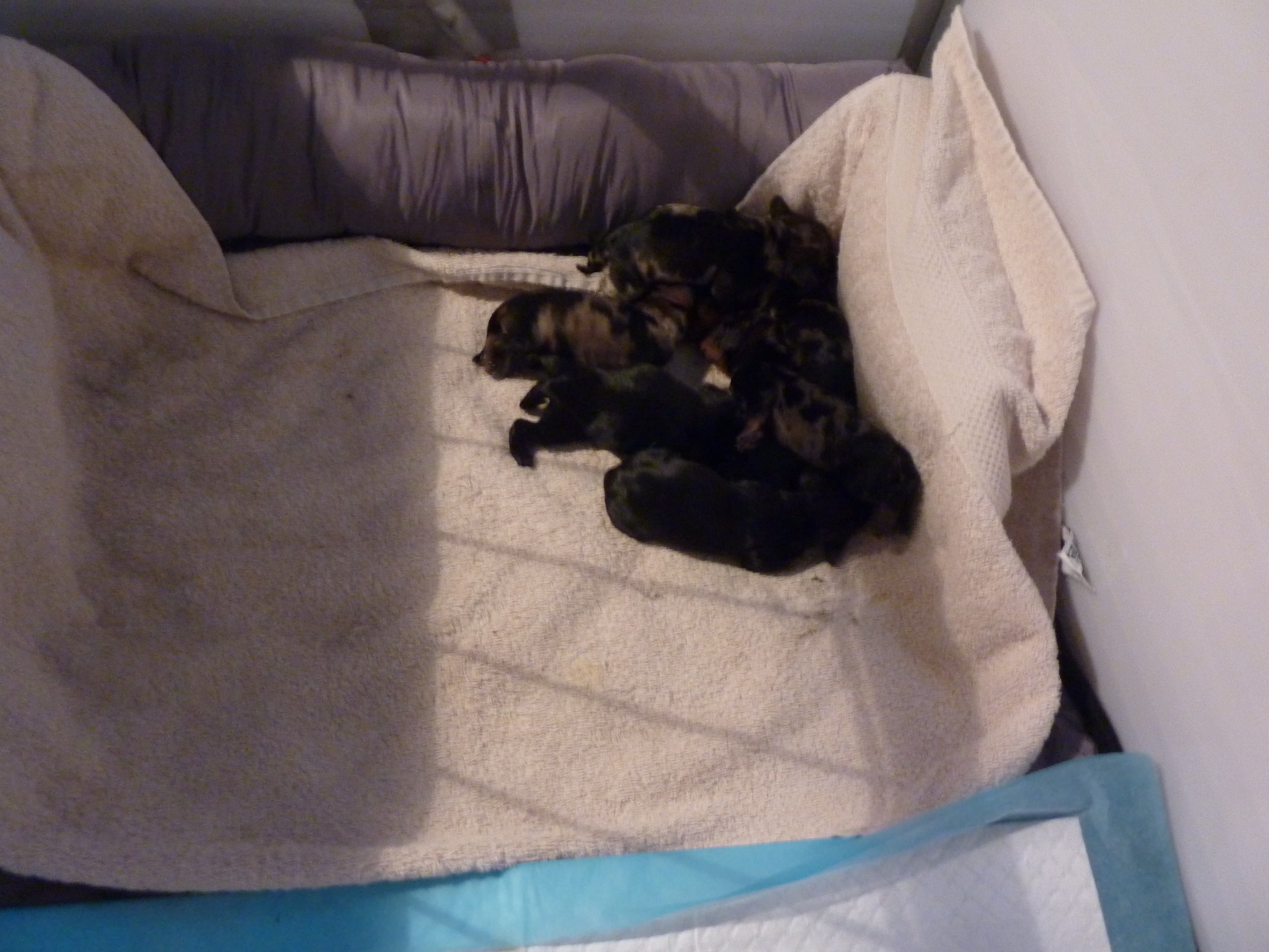 In de nacht van maandag op dinsdag 26 op 27 juni om 02.15 uur werd de eerste pup geboren om 06.10 uur de zesde pup. Het zijn vier meisjes en twee jongens geworden. De kleuren zijn 1 X wildkleur, 1 X black en tan, 1 X zwart zilver getijgerd, 1 choco getijgerd, 1 X wildkleur getijgerd, 1 X bruin getijgerd. De pups zijn nu bijna een week oud en zijn verdubbeld in gewicht. Zijn beweeglijk en glimmen als spiegeltjes. Moeder Janz is een zeer zorgzame moeder en is er nu nog veel bij! Zie de foto’s van dit toverballennestje!