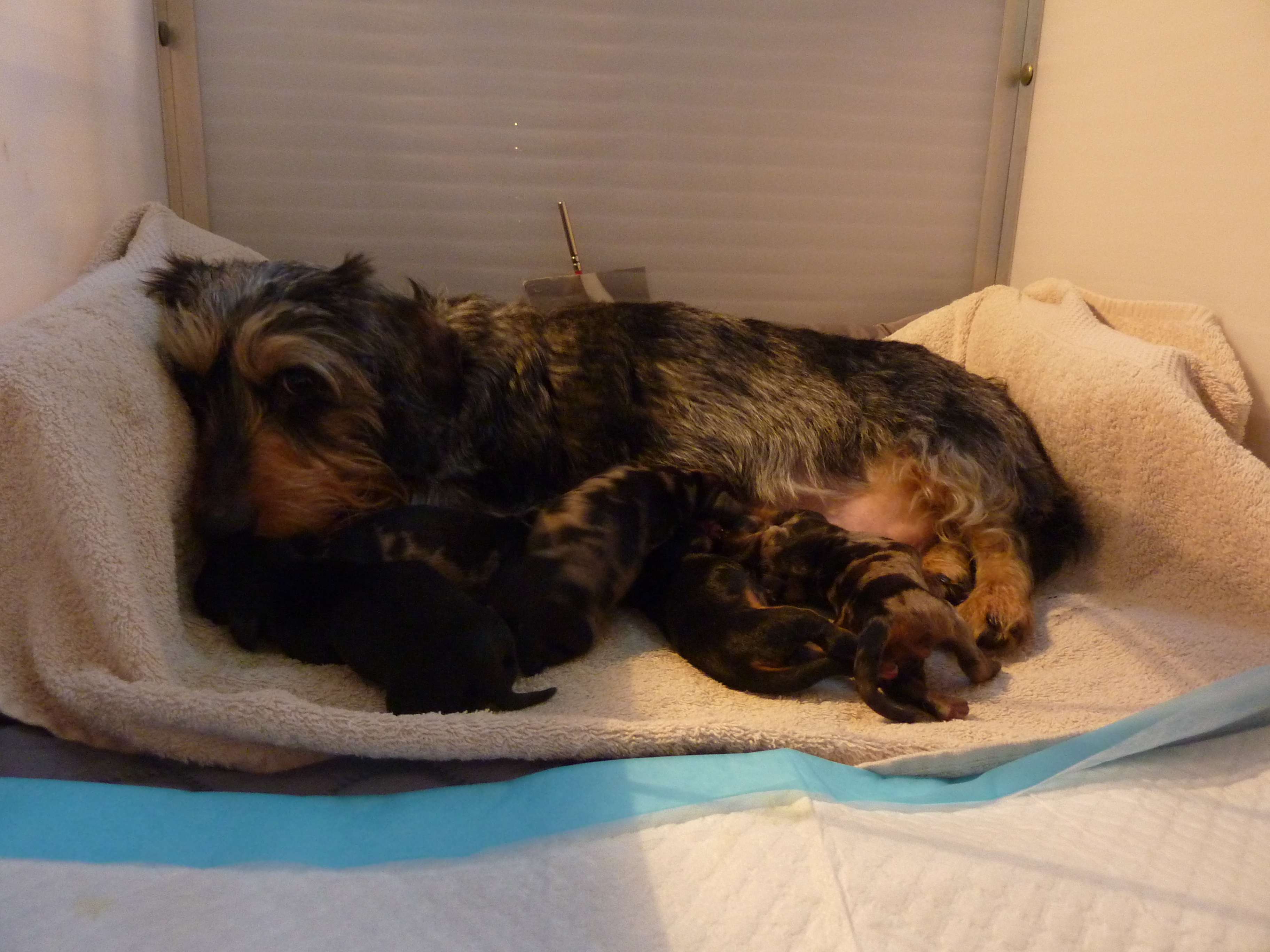 Na goede raad van Coby van teckelkennel Uut de Slikhoek, zijn we direct begonnen met sondevoeding. Op dag vier begonnen de eerste drie puppy’s mondjesmaat bij Janz te drinken, gevolgd door nummer vier op dag vijf. Nadat de puppy’s allemaal dronken bij mama was de kritieke fase achter de rug. De puppy’s zullen nog enkele dagen worden bijgevoerd totdat de melkproductie bij Janz op volle kracht werkt! Janz is een super moedertje en doet het fantastisch. Wij hopen weer een mooie tijd tegemoet te gaan met deze wolken van puppy’s.