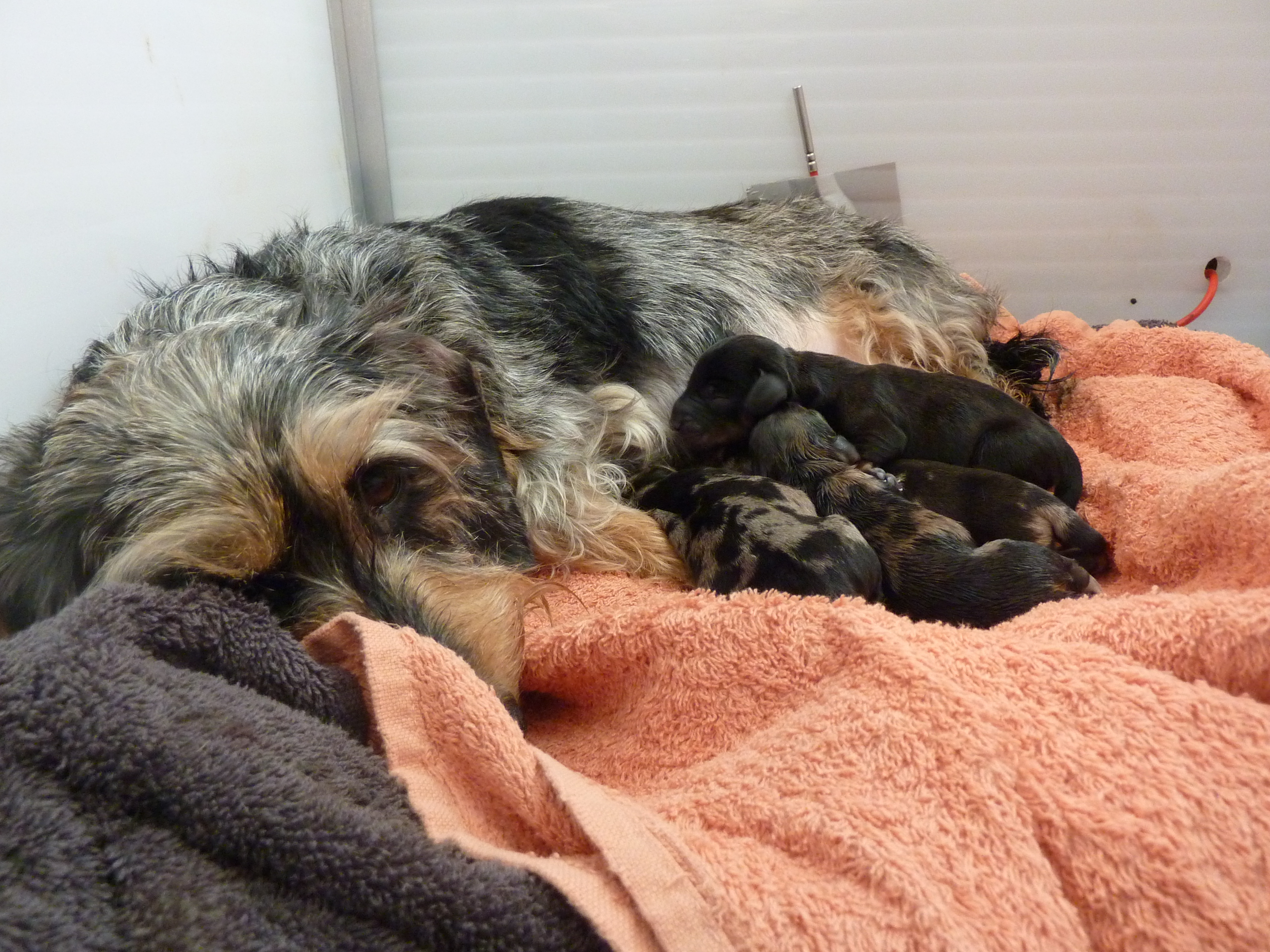 Het was een zware dag en Pleuntje heeft goed haar best gedaan, echter was er een “dwarsligger” waarna er een keizersnede volgde. Uiteindelijk zijn er 3 wildkleur teefjes, 1 rood teefje en 1 wildkleur reutje geboren. De puppy’s en Pleuntje zijn de nacht goed doorgekomen en de puppy’s hebben inmiddels de moedermelk gevonden en Pleuntje heeft haar rol als moeder opgepakt en heeft inmiddels gegeten en gedronken. Het blijft iedere keer bijzonder hoe snel puppy’s weten waar ze moeten zijn en hoe Pleuntje haar moederrol pakt.